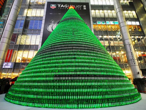 9. L’albero di Natale fatto con le bottiglie di Heineken. Bottiglie verdi per un gigantesco albero green costruito con 1000 bottiglie della nota marca di birra.