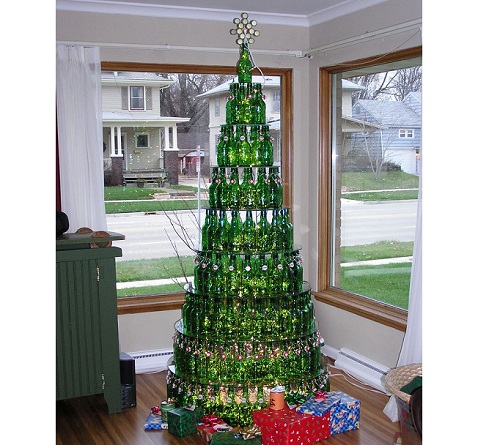Naturalmente non per forza ci si deve limitare a piccole decorazioni con il vetro recuperato: con le bottiglie (di birra, dell’acqua, o di qualsiasi altra cosa) è possibile creare alberi di medie o grandi dimensioni. Costruirli è semplicissimo, basta posizionare le bottiglie con cura in strutture via via più sottili, concentriche o piramidali, dopodiché aggiungere festoni e altre decorazioni a piacimento. Con un po’ di fantasia si può immaginare ogni tipo di oggetto convertito, con qualche tocco, a decorazione natalizia d’effetto: si pensi per esempio ai vecchi contenitori in vetro per le conserve, o il caffè. Disegnando qualcosa che richiami l’atmosfera natalizia su una parte della superficie esterna (o su tutta) e poi ponendo all’interno del contenitore una candela darà vita a una originale, ecologica decorazione natalizia.